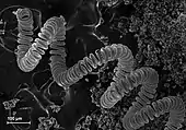 Image MEB du filament de tungstène d'une lampe à incandescence.
