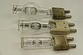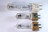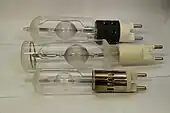 Les lampes aux halogénures métalliques sont des lampes à arc de taille moyenne avec cycle halogène. Elles sont relativement similaires aux lampes à vapeur de mercure mais les éléments constitutifs sont différents. L'ampoule est composée d'une sphère (le bulbe) en quartz[13] résistant à la pression (35 bars)[13] et à la température (950 °C)[13] et de forte épaisseur (jusqu'à 5 mm)[13] associée à deux longues électrodes[13].