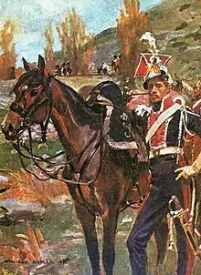 Napoléon tente de négocier la paix avec le tsar Alexandre Ier, mais la manœuvre échoue et l'Empereur donne l'ordre de quitter Moscou le 19 octobre. Le 1er lanciers est placé en arrière-garde avec pour mission de couvrir le passage de la Desna par les troupes françaises[67]. En quittant Moscou, les chevau-légers, habitués aux hivers rigoureux de l'est de l'Europe, équipent leurs chevaux de fers à glace. Pendant la retraite, les lanciers polonais ne sont pas épargnés par le froid mais sont le plus souvent évités par les cosaques de l'armée russe qui préfèrent s'en prendre aux lanciers rouges[68]. À Gorodnia, alors que Napoléon effectue une reconnaissance avec son état-major, une nuée de cosaques surgit et met la sécurité de l'Empereur en danger[55]. L'escadron polonais de service commandé par Kozietulski accourt, engage les cavaliers russes et, avec le soutien des chasseurs, dragons et grenadiers à cheval de la Garde, met les assaillants en déroute au prix de six hommes tués. Au cours de la mêlée, le chef d'escadron Kozietulski est blessé d'un coup de lance en chargeant à la tête de son escadron[69].