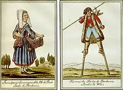 Le besoin de traverser des landes rases et souvent inondées leur a fait adopter l'usage d'échasses communément nommées xcanques, qui les élèvent de toute leur hauteur au dessus du sol et leur permettent de parcourir des distances triples de celles qu'ils parcourraient sans leur secours[4]. Ils ont aussi la facilité de promener la vue sur la lande à de grandes distances et de veiller plus sûrement sur leur troupeau. Ces échasses, attachées aux côtés extérieurs des cuisses, qu'elles emboîtent en partie, sont du côté intérieur garnies d'une planchette ou étrier, sur lequel ils posent le pied. Les bergers ont en outre un grand bâton sur lequel ils s'appuient quand ils veulent s'arrêter et portent un fusil en bandoulière afin de se défendre contre les loups[4]. Les femmes landaises sont vêtues d'étoffes grossières en 1835 et leur corset laisse voir leur gorge. Elles ont pour coiffure, les jours de travail, une espèce de capuce formée de plusieurs mouchoirs et sur laquelle les jours de fête elles posent un chapeau à larges bords, garni d'un ruban noir et souvent orné d'une tige fleurie d'immortelle de mer (Athanasia maritima)[4].