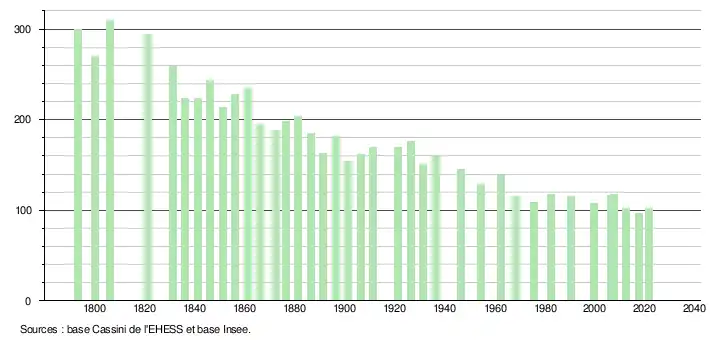L'évolution du nombre d'habitants est connue à travers les recensements de la population effectués dans la commune depuis 1793. Pour les communes de moins de 10 000 habitants, une enquête de recensement portant sur toute la population est réalisée tous les cinq ans, les populations légales des années intermédiaires étant quant à elles estimées par interpolation ou extrapolation[23]. Pour la commune, le premier recensement exhaustif entrant dans le cadre du nouveau dispositif a été réalisé en 2007[24].