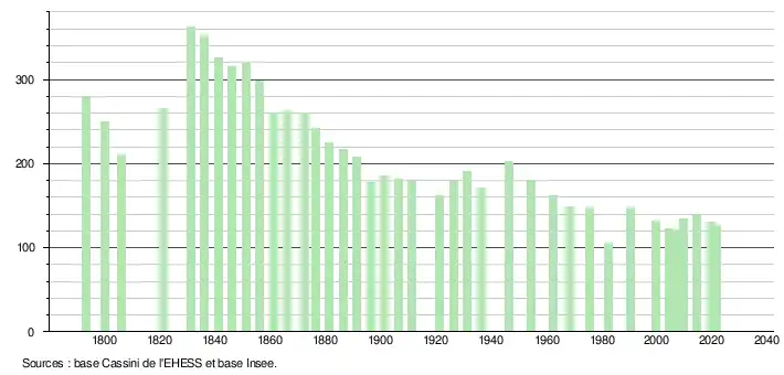 L'évolution du nombre d'habitants est connue à travers les recensements de la population effectués dans la commune depuis 1793. Pour les communes de moins de 10 000 habitants, une enquête de recensement portant sur toute la population est réalisée tous les cinq ans, les populations légales des années intermédiaires étant quant à elles estimées par interpolation ou extrapolation[26]. Pour la commune, le premier recensement exhaustif entrant dans le cadre du nouveau dispositif a été réalisé en 2004[27].