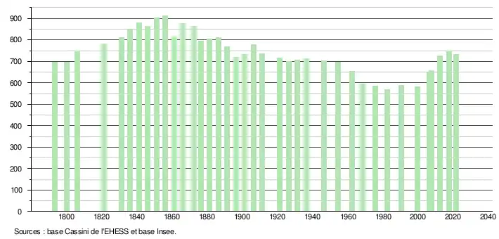 L'évolution du nombre d'habitants est connue à travers les recensements de la population effectués dans la commune depuis 1793. Pour les communes de moins de 10 000 habitants, une enquête de recensement portant sur toute la population est réalisée tous les cinq ans, les populations légales des années intermédiaires étant quant à elles estimées par interpolation ou extrapolation[51]. Pour la commune, le premier recensement exhaustif entrant dans le cadre du nouveau dispositif a été réalisé en 2007[52].