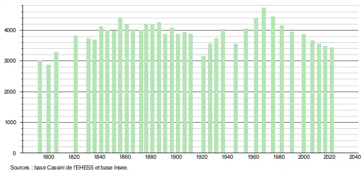 - Population municipale légale en vigueur au 1er janvier 2024, millésimée 2021, définie dans les limites territoriales en vigueur au 1er janvier 2023, date de référence statistique : 1er janvier 2021.