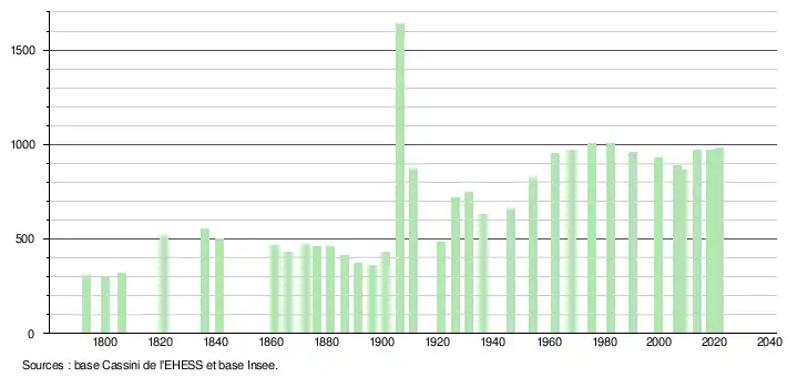 L'évolution du nombre d'habitants est connue à travers les recensements de la population effectués dans la commune depuis 1793. Pour les communes de moins de 10 000 habitants, une enquête de recensement portant sur toute la population est réalisée tous les cinq ans, les populations légales des années intermédiaires étant quant à elles estimées par interpolation ou extrapolation[22]. Pour la commune, le premier recensement exhaustif entrant dans le cadre du nouveau dispositif a été réalisé en 2008[23].