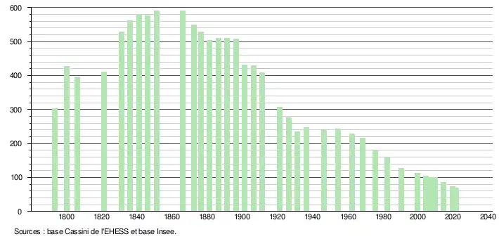 L'évolution du nombre d'habitants est connue à travers les recensements de la population effectués dans la commune depuis 1793. Pour les communes de moins de 10 000 habitants, une enquête de recensement portant sur toute la population est réalisée tous les cinq ans, les populations légales des années intermédiaires étant quant à elles estimées par interpolation ou extrapolation[18]. Pour la commune, le premier recensement exhaustif entrant dans le cadre du nouveau dispositif a été réalisé en 2004[19].