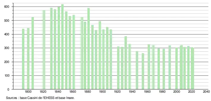 L'évolution du nombre d'habitants est connue à travers les recensements de la population effectués dans la commune depuis 1793. Pour les communes de moins de 10 000 habitants, une enquête de recensement portant sur toute la population est réalisée tous les cinq ans, les populations légales des années intermédiaires étant quant à elles estimées par interpolation ou extrapolation[17]. Pour la commune, le premier recensement exhaustif entrant dans le cadre du nouveau dispositif a été réalisé en 2005[18].