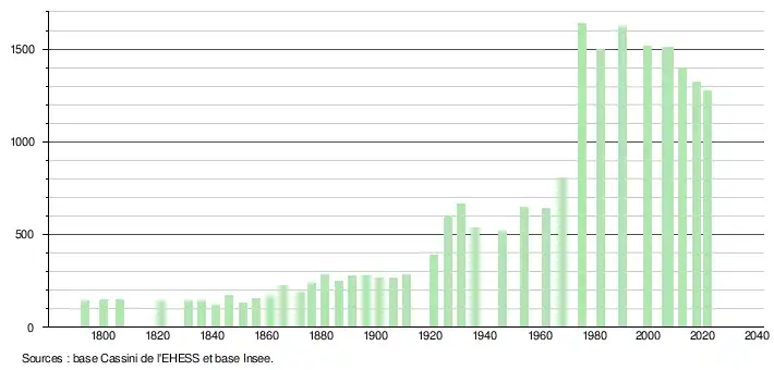 L'évolution du nombre d'habitants est connue à travers les recensements de la population effectués dans la commune depuis 1793. Pour les communes de moins de 10 000 habitants, une enquête de recensement portant sur toute la population est réalisée tous les cinq ans, les populations légales des années intermédiaires étant quant à elles estimées par interpolation ou extrapolation[18]. Pour la commune, le premier recensement exhaustif entrant dans le cadre du nouveau dispositif a été réalisé en 2007[19].
