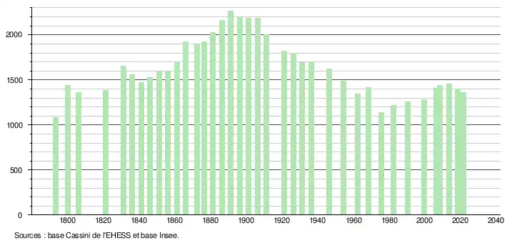 L'évolution du nombre d'habitants est connue à travers les recensements de la population effectués dans la commune depuis 1793. Pour les communes de moins de 10 000 habitants, une enquête de recensement portant sur toute la population est réalisée tous les cinq ans, les populations légales des années intermédiaires étant quant à elles estimées par interpolation ou extrapolation[26]. Pour la commune, le premier recensement exhaustif entrant dans le cadre du nouveau dispositif a été réalisé en 2008[27].