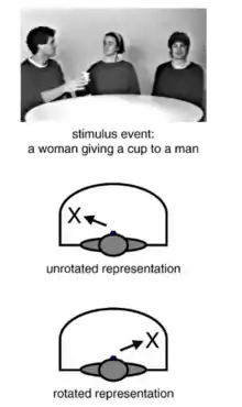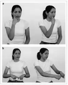 Pointer un endroit de l'espace correspond à la fonction grammaticale du pronom, le point de l'espace servant à symboliser un référent préalablement identifié. C'est ce qui permet de faire le lien avec la modulation spatiale des gestes désignant une action, à la fois pour préciser l'argument (sujet ou objet) de cette action, et maintenir cette identité du référent tout au long du discours[9].