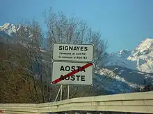 L'émigration des Valdôtains de souche, notamment vers la France, surtout vers Paris[7], et vers Genève (où encore aujourd'hui sont présentes des communautés d'immigrés), unie à l'immigration de Vénitiens et de Calabrais soutenue par le régime fasciste et par l'installation de l'industrie sidérurgique Cogne et l'exploitation des mines de Cogne et de charbon à La Thuile, l'interdiction de la langue française et la fermeture des écoles de hameau contribuèrent à bouleverser durablement cette société montagnarde isolée. Tous les toponymes furent italianisés (Morgex en Valdigna d'Aosta, Chamois en Camosio, Champorcher en Campo Laris, etc.). Un projet similaire pour les patronymes fut arrêté avec la libération de l'Italie et la chute du fascisme. Le français étant banni, la population se rabattit sur la pratique orale du francoprovençal, tolérée par les autorités. Le français était enseigné en cachette, dans la plupart des cas par les curés.