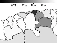 - le kabyle (taqbaylit) : est parlé principalement en Kabylie (région du nord-est de l'Algérie), le nombre de locuteurs est estimé à plus de 5 millions en Kabylie et dans l'Algérois[9], c'est la première langue au nombre de locuteurs berbèrophones dans le pays. Il se présente sous la forme de quatre zones dialectales ;