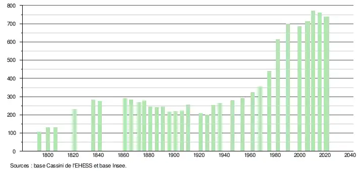 L'évolution du nombre d'habitants est connue à travers les recensements de la population effectués dans la commune depuis 1793. Pour les communes de moins de 10 000 habitants, une enquête de recensement portant sur toute la population est réalisée tous les cinq ans, les populations légales des années intermédiaires étant quant à elles estimées par interpolation ou extrapolation[20]. Pour la commune, le premier recensement exhaustif entrant dans le cadre du nouveau dispositif a été réalisé en 2005[21].