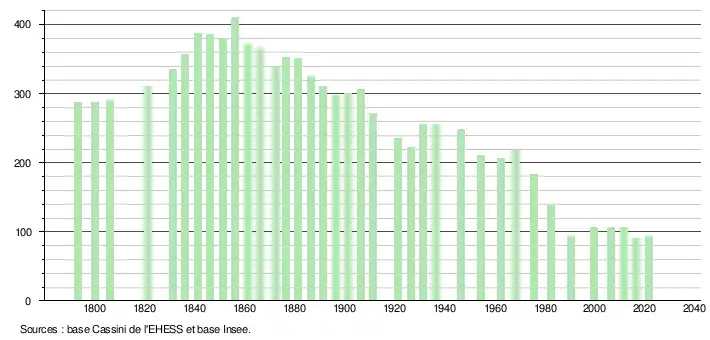 L'évolution du nombre d'habitants est connue à travers les recensements de la population effectués dans la commune depuis 1793. Pour les communes de moins de 10 000 habitants, une enquête de recensement portant sur toute la population est réalisée tous les cinq ans, les populations légales des années intermédiaires étant quant à elles estimées par interpolation ou extrapolation[20]. Pour la commune, le premier recensement exhaustif entrant dans le cadre du nouveau dispositif a été réalisé en 2006[21].