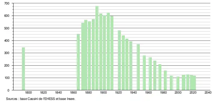 L'évolution du nombre d'habitants est connue à travers les recensements de la population effectués dans la commune depuis 1793. Pour les communes de moins de 10 000 habitants, une enquête de recensement portant sur toute la population est réalisée tous les cinq ans, les populations légales des années intermédiaires étant quant à elles estimées par interpolation ou extrapolation[14]. Pour la commune, le premier recensement exhaustif entrant dans le cadre du nouveau dispositif a été réalisé en 2007[15].