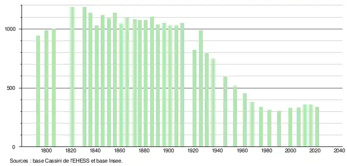 L'évolution du nombre d'habitants est connue à travers les recensements de la population effectués dans la commune depuis 1793. Pour les communes de moins de 10 000 habitants, une enquête de recensement portant sur toute la population est réalisée tous les cinq ans, les populations légales des années intermédiaires étant quant à elles estimées par interpolation ou extrapolation[41]. Pour la commune, le premier recensement exhaustif entrant dans le cadre du nouveau dispositif a été réalisé en 2006[42].