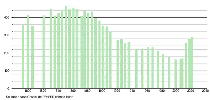 L'évolution du nombre d'habitants est connue à travers les recensements de la population effectués dans la commune depuis 1793. Pour les communes de moins de 10 000 habitants, une enquête de recensement portant sur toute la population est réalisée tous les cinq ans, les populations légales des années intermédiaires étant quant à elles estimées par interpolation ou extrapolation[28]. Pour la commune, le premier recensement exhaustif entrant dans le cadre du nouveau dispositif a été réalisé en 2008[29].