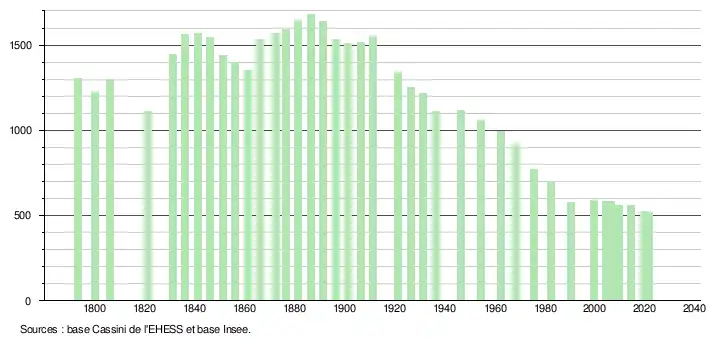 L'évolution du nombre d'habitants est connue à travers les recensements de la population effectués dans la commune depuis 1793. Pour les communes de moins de 10 000 habitants, une enquête de recensement portant sur toute la population est réalisée tous les cinq ans, les populations légales des années intermédiaires étant quant à elles estimées par interpolation ou extrapolation[32]. Pour la commune, le premier recensement exhaustif entrant dans le cadre du nouveau dispositif a été réalisé en 2004[33].