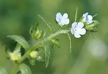 - Fleurs très petites (2 à 4 millimètres de large), bleues (et rarement blanches), positionnées près des rameaux avec racème de cymes unipares scorpioïdes, unilatéral, qui s'allonge en devenant lâche ;
