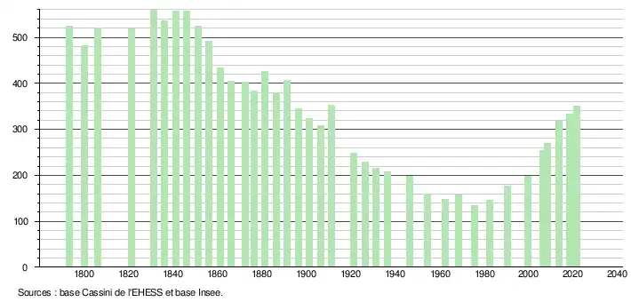 L'évolution du nombre d'habitants est connue à travers les recensements de la population effectués dans la commune depuis 1793. Pour les communes de moins de 10 000 habitants, une enquête de recensement portant sur toute la population est réalisée tous les cinq ans, les populations légales des années intermédiaires étant quant à elles estimées par interpolation ou extrapolation[18]. Pour la commune, le premier recensement exhaustif entrant dans le cadre du nouveau dispositif a été réalisé en 2008[19].