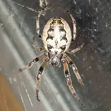 Son abdomen est ovale, beige et orné de taches brunes. L'ornementation abdominale varie peu selon les spécimens. Le céphalothorax est petit, velu et quelque peu en retrait sous le lobe frontal de l'abdomen. Ses pattes sont ornées de bandes brunes et pourvues de petites épines.