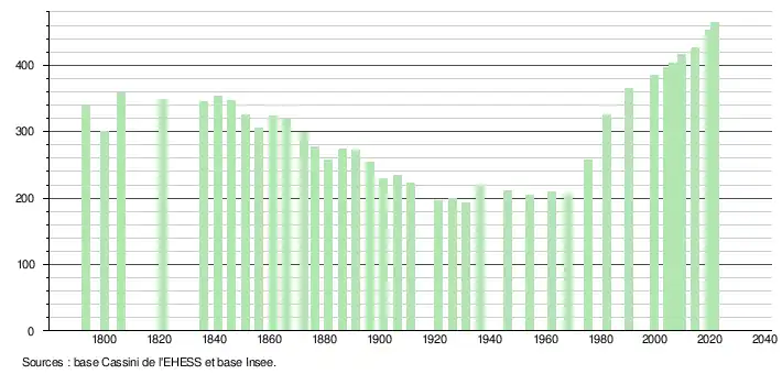 L'évolution du nombre d'habitants est connue à travers les recensements de la population effectués dans la commune depuis 1793. Pour les communes de moins de 10 000 habitants, une enquête de recensement portant sur toute la population est réalisée tous les cinq ans, les populations légales des années intermédiaires étant quant à elles estimées par interpolation ou extrapolation[24]. Pour la commune, le premier recensement exhaustif entrant dans le cadre du nouveau dispositif a été réalisé en 2004[25].