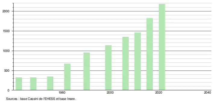 L'évolution du nombre d'habitants est connue à travers les recensements de la population effectués dans la commune depuis 1962. Pour les communes de moins de 10 000 habitants, une enquête de recensement portant sur toute la population est réalisée tous les cinq ans, les populations légales des années intermédiaires étant quant à elles estimées par interpolation ou extrapolation[37]. Pour la commune, le premier recensement exhaustif entrant dans le cadre du nouveau dispositif a été réalisé en 2006[38].