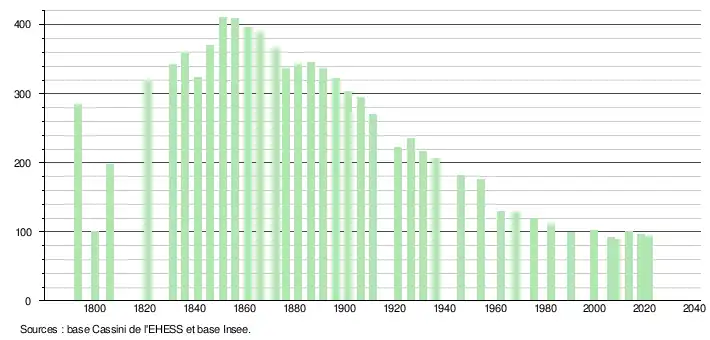L'évolution du nombre d'habitants est connue à travers les recensements de la population effectués dans la commune depuis 1793. Pour les communes de moins de 10 000 habitants, une enquête de recensement portant sur toute la population est réalisée tous les cinq ans, les populations légales des années intermédiaires étant quant à elles estimées par interpolation ou extrapolation[25]. Pour la commune, le premier recensement exhaustif entrant dans le cadre du nouveau dispositif a été réalisé en 2008[26]. En 2021, la commune comptait 94 habitants[Note 4], en diminution de 11,32 % par rapport à 2015 (Hautes-Pyrénées : +1,04 %, France hors Mayotte : +1,84 %). |