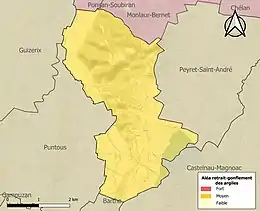 Le retrait-gonflement des sols argileux est susceptible d'engendrer des dommages importants aux bâtiments en cas d’alternance de périodes de sécheresse et de pluie. La totalité de la commune est en aléa moyen ou fort (44,5 % au niveau départemental et 48,5 % au niveau national). Sur les 71 bâtiments dénombrés sur la commune en 2019, 71 sont en aléa moyen ou fort, soit 100 %, à comparer aux 75 % au niveau départemental et 54 % au niveau national. Une cartographie de l'exposition du territoire national au retrait gonflement des sols argileux est disponible sur le site du BRGM[19],[Carte 2].