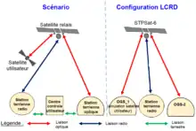 - Le satellite utilisateur a simultanément une liaison optique descendante avec une station terrienne et une liaison optique montante avec une autre station en utilisant un modulation différente (dans ce scénario seul le segment terrestre de LCRD est mis en œuvre).