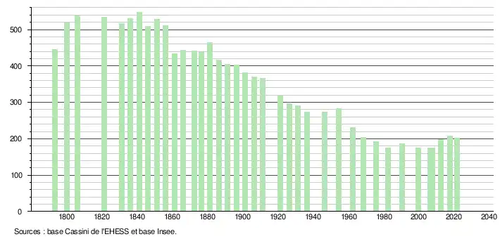 L'évolution du nombre d'habitants est connue à travers les recensements de la population effectués dans la commune depuis 1793. Pour les communes de moins de 10 000 habitants, une enquête de recensement portant sur toute la population est réalisée tous les cinq ans, les populations légales des années intermédiaires étant quant à elles estimées par interpolation ou extrapolation[38]. Pour la commune, le premier recensement exhaustif entrant dans le cadre du nouveau dispositif a été réalisé en 2007[39].