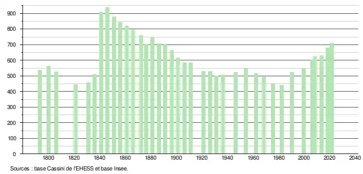 L'évolution du nombre d'habitants est connue à travers les recensements de la population effectués dans la commune depuis 1793. Pour les communes de moins de 10 000 habitants, une enquête de recensement portant sur toute la population est réalisée tous les cinq ans, les populations légales des années intermédiaires étant quant à elles estimées par interpolation ou extrapolation[23]. Pour la commune, le premier recensement exhaustif entrant dans le cadre du nouveau dispositif a été réalisé en 2008[24].