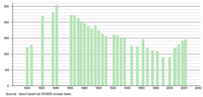 L'évolution du nombre d'habitants est connue à travers les recensements de la population effectués dans la commune depuis 1800. Pour les communes de moins de 10 000 habitants, une enquête de recensement portant sur toute la population est réalisée tous les cinq ans, les populations légales des années intermédiaires étant quant à elles estimées par interpolation ou extrapolation[16]. Pour la commune, le premier recensement exhaustif entrant dans le cadre du nouveau dispositif a été réalisé en 2007[17].