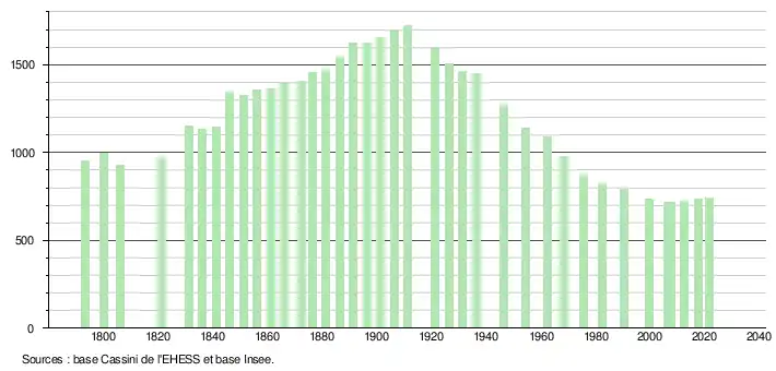 L'évolution du nombre d'habitants est connue à travers les recensements de la population effectués dans la commune depuis 1793. Pour les communes de moins de 10 000 habitants, une enquête de recensement portant sur toute la population est réalisée tous les cinq ans, les populations légales des années intermédiaires étant quant à elles estimées par interpolation ou extrapolation[25]. Pour la commune, le premier recensement exhaustif entrant dans le cadre du nouveau dispositif a été réalisé en 2007[26].