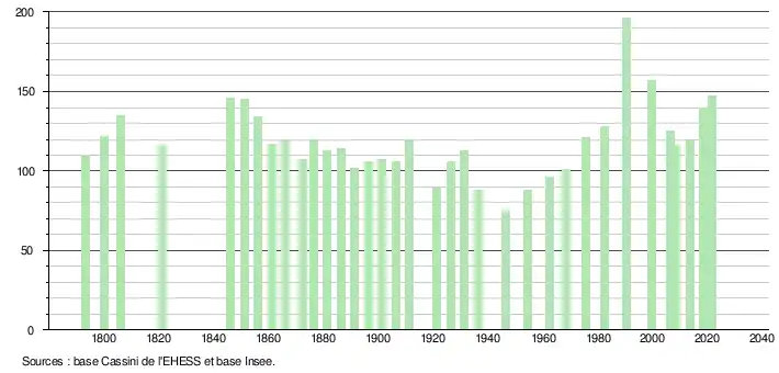 L'évolution du nombre d'habitants est connue à travers les recensements de la population effectués dans la commune depuis 1793. Pour les communes de moins de 10 000 habitants, une enquête de recensement portant sur toute la population est réalisée tous les cinq ans, les populations légales des années intermédiaires étant quant à elles estimées par interpolation ou extrapolation[14]. Pour la commune, le premier recensement exhaustif entrant dans le cadre du nouveau dispositif a été réalisé en 2008[15].