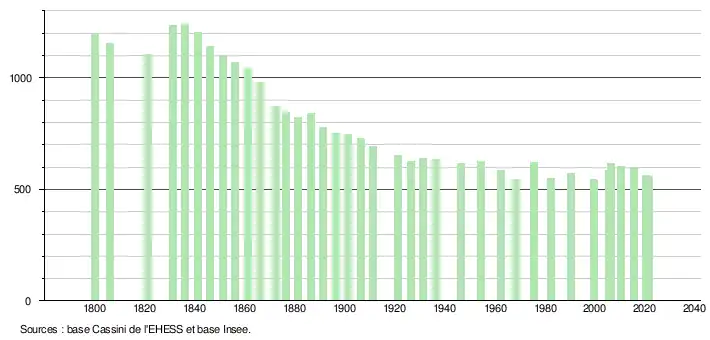 L'évolution du nombre d'habitants est connue à travers les recensements de la population effectués dans la commune depuis 1800. Pour les communes de moins de 10 000 habitants, une enquête de recensement portant sur toute la population est réalisée tous les cinq ans, les populations légales des années intermédiaires étant quant à elles estimées par interpolation ou extrapolation[22]. Pour la commune, le premier recensement exhaustif entrant dans le cadre du nouveau dispositif a été réalisé en 2005[23].