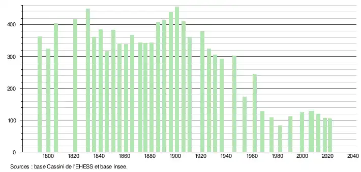 L'évolution du nombre d'habitants est connue à travers les recensements de la population effectués dans la commune depuis 1793. Pour les communes de moins de 10 000 habitants, une enquête de recensement portant sur toute la population est réalisée tous les cinq ans, les populations légales des années intermédiaires étant quant à elles estimées par interpolation ou extrapolation[19]. Pour la commune, le premier recensement exhaustif entrant dans le cadre du nouveau dispositif a été réalisé en 2007[20].