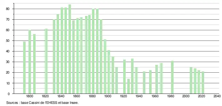 L'évolution du nombre d'habitants est connue à travers les recensements de la population effectués dans la commune entre 1793 et 1973, dans la commune associée de 1973 à 2016 et dans la commune déléguée depuis 2017. À partir de 2006, les populations légales des communes sont publiées annuellement par l'Insee. Le recensement repose désormais sur une collecte d'information annuelle, concernant successivement tous les territoires communaux au cours d'une période de cinq ans. Pour les communes de moins de 10 000 habitants, une enquête de recensement portant sur toute la population est réalisée tous les cinq ans, les populations légales des années intermédiaires étant quant à elles estimées par interpolation ou extrapolation[28]. Pour la commune déléguée, le premier recensement exhaustif, lié à celui de Colombey-les-Deux-Églises, entrant dans le cadre du nouveau dispositif a été réalisé en 2006[29].