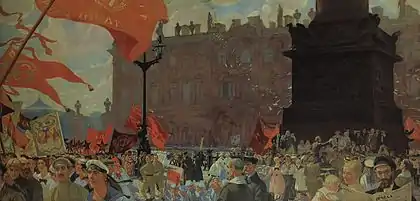 C'est d'après ses souvenirs récents de l'année 1917 que Koustodiev a peint son étude [6][7] (90 × 72 centimètres]; toile, huile; galerie Tretiakov)[8]. La fille du peintre, Irina, raconte [9]: « Je me souviens d'une journée froide, la fumée des cheminées montait droit au ciel. De la grande fenêtre de l'atelier qui donne sur la rue Vvedenskaïa on pouvait voir la rue enneigée. Les tas de neige avaient des reflets bleu foncé. Le soleil d'hiver éclairait la foule porteuse de drapeaux rouges. Juste devant chez nous s'est arrêté un camion de soldats. Beaucoup portaient des drapeaux rouges à leur fusil. Père m'a demandé de pousser jusqu'à la fenêtre sa chaise d'invalide à laquelle il était déjà "enchaîné" depuis plus d'un an. […] Je lui avance la chaise. L'atelier était silencieux, dehors la rue était fort animée. Quelqu'un cria. La foule était grouillante. Mais les cris ne s'entendaient pas dans le studio. Père a peint durant trois heures jusqu'à ce que le soleil disparaisse. Quand je vis ses yeux ils étaient humides, en larmes. Pensant à ses douleurs je lui apporte ses médicaments. Irotchka tu ne comprends pas le genre de bonheur que nous ressentons à la vue du drapeau rouge de la liberté! » Et, en effet, cette journée a été l'apothéose de la révolution de février 1917 permettant, après l'abdication du Tsar, la constitution du Gouvernement provisoire[10],[11]. Selon l'avis des critiques sur le tableau, le débordement de foule, les soldats en liesse avec leurs drapeaux rouges, le tout éclairé par des couleurs vives témoigne bien de l'accueil sincère et favorable de la révolution par Koustodiev [12],[7].