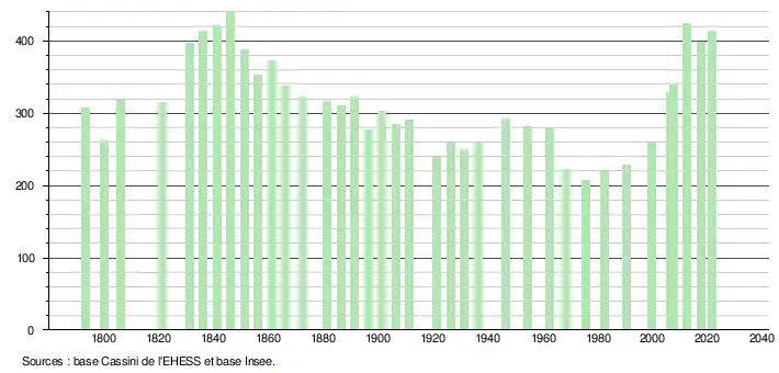 L'évolution du nombre d'habitants est connue à travers les recensements de la population effectués dans la commune depuis 1793. Pour les communes de moins de 10 000 habitants, une enquête de recensement portant sur toute la population est réalisée tous les cinq ans, les populations légales des années intermédiaires étant quant à elles estimées par interpolation ou extrapolation[25]. Pour la commune, le premier recensement exhaustif entrant dans le cadre du nouveau dispositif a été réalisé en 2007[26].
