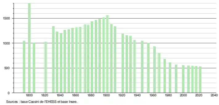 L'évolution du nombre d'habitants est connue à travers les recensements de la population effectués dans la commune depuis 1793. Pour les communes de moins de 10 000 habitants, une enquête de recensement portant sur toute la population est réalisée tous les cinq ans, les populations légales des années intermédiaires étant quant à elles estimées par interpolation ou extrapolation[21]. Pour la commune, le premier recensement exhaustif entrant dans le cadre du nouveau dispositif a été réalisé en 2006[22].