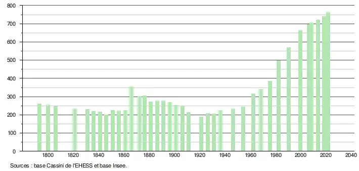 L'évolution du nombre d'habitants est connue à travers les recensements de la population effectués dans la commune depuis 1793. Pour les communes de moins de 10 000 habitants, une enquête de recensement portant sur toute la population est réalisée tous les cinq ans, les populations légales des années intermédiaires étant quant à elles estimées par interpolation ou extrapolation[22]. Pour la commune, le premier recensement exhaustif entrant dans le cadre du nouveau dispositif a été réalisé en 2008[23].