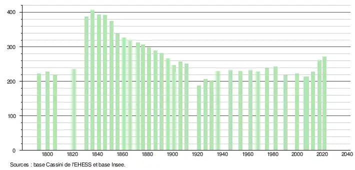 L'évolution du nombre d'habitants est connue à travers les recensements de la population effectués dans la commune depuis 1793. Pour les communes de moins de 10 000 habitants, une enquête de recensement portant sur toute la population est réalisée tous les cinq ans, les populations légales des années intermédiaires étant quant à elles estimées par interpolation ou extrapolation[16]. Pour la commune, le premier recensement exhaustif entrant dans le cadre du nouveau dispositif a été réalisé en 2007[17].