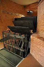 - L'autre véhiculant l'eau filtrée, prélevée par infiltration sous la prairie des Filtres, dont le nom découle justement de ce système. « Elle est filtrée par son lavage à travers un banc de sable qui forme en ce point le bord du fleuve [...] : des galeries à parois perméables ont été ménagées dans ce banc, à 1 mètre au-dessous de l'étiage et sur un développement de près de 400 mètres »[3]. L'eau ainsi filtrée montait par pompage les trois niveaux supérieurs au rez-de-chaussée dans de larges conduites pour arriver dans une auge annulaire occupant une partie du quatrième étage. Cette vasque faisait office de trop-plein et permettait de rattraper les à-coups des mécanismes de pompage, régulant ainsi le débit pour permettre l'écoulement constant des fontaines. Élevée à 20 mètres au-dessus du sol, soit 146 mètres d'altitude, à un niveau situé un peu plus de six mètres au-dessus de la place Rouaix - qui était alors le point le plus haut destiné à être alimenté - l'eau redescendait simplement par gravité et bifurquait afin de traverser la Garonne par le Pont-Neuf pour être ensuite distribuée à près de cinquante mille Toulousains.