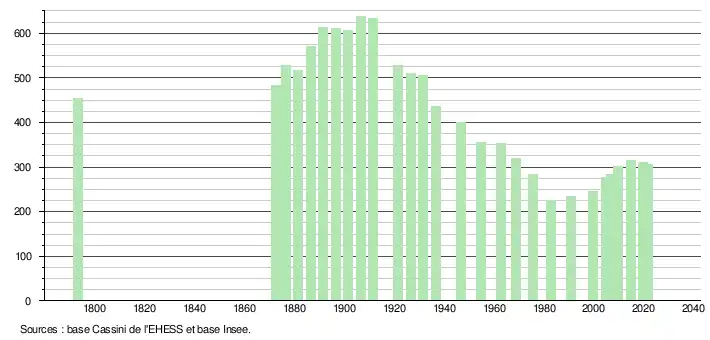 L'évolution du nombre d'habitants est connue à travers les recensements de la population effectués dans la commune depuis 1793. Pour les communes de moins de 10 000 habitants, une enquête de recensement portant sur toute la population est réalisée tous les cinq ans, les populations légales des années intermédiaires étant quant à elles estimées par interpolation ou extrapolation[30]. Pour la commune, le premier recensement exhaustif entrant dans le cadre du nouveau dispositif a été réalisé en 2004[31].