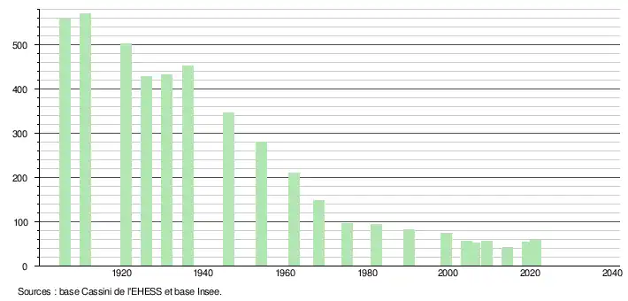 L'évolution du nombre d'habitants est connue à travers les recensements de la population effectués dans la commune depuis 1906. Pour les communes de moins de 10 000 habitants, une enquête de recensement portant sur toute la population est réalisée tous les cinq ans, les populations légales des années intermédiaires étant quant à elles estimées par interpolation ou extrapolation[15]. Pour la commune, le premier recensement exhaustif entrant dans le cadre du nouveau dispositif a été réalisé en 2004[16].