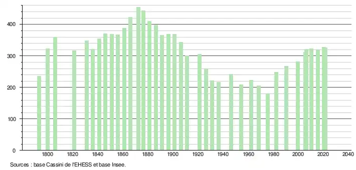 L'évolution du nombre d'habitants est connue à travers les recensements de la population effectués dans la commune depuis 1793. Pour les communes de moins de 10 000 habitants, une enquête de recensement portant sur toute la population est réalisée tous les cinq ans, les populations légales des années intermédiaires étant quant à elles estimées par interpolation ou extrapolation[20]. Pour la commune, le premier recensement exhaustif entrant dans le cadre du nouveau dispositif a été réalisé en 2005[21].
