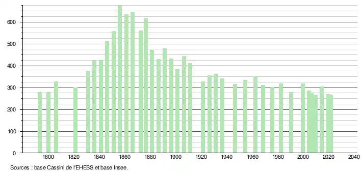 L'évolution du nombre d'habitants est connue à travers les recensements de la population effectués dans la commune depuis 1793. Pour les communes de moins de 10 000 habitants, une enquête de recensement portant sur toute la population est réalisée tous les cinq ans, les populations légales des années intermédiaires étant quant à elles estimées par interpolation ou extrapolation[25]. Pour la commune, le premier recensement exhaustif entrant dans le cadre du nouveau dispositif a été réalisé en 2004[26].