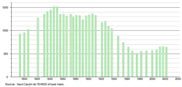 La densité de la population est de 20,6 habitants par km2 en 2006. Entre 1998 et 2006, la commune a enregistré 93 naissances et 55 décès, ayant donc un solde naturel positif de 38 personnes (+ 0,5 % l'an). Entre 1975 et 1999, la commune a aussi connu un solde migratoire positif, contrairement au siècle précédent[39].