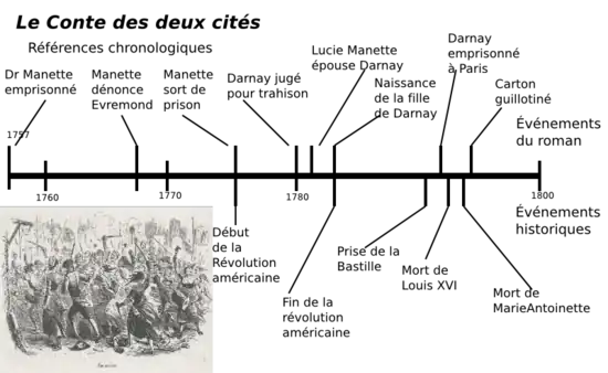 Douzième roman de Dickens, il appartient à sa dernière période, « plus empreinte de gravité » (a graver man), selon Sidney Dark, et « plus soigneuse de la création artistique » (a more careful literary artist)[5]. Il se situe au temps de la Révolution française à Paris et à Londres, les « deux cités » du titre, et culmine en 1793 à Paris sous la Terreur.
